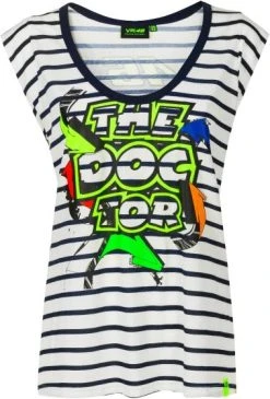 Woman t-shirts part of VR46 Lifestyle 2020 collection by Valentino Rossi. In cotton, modern fit with neckline and short sleeves, on the chest a beautiful print of Valentino riding at the Tavullia Motor Ranch and the VRFORTYSIX logo are printed . The Motor Ranch logo on the back.